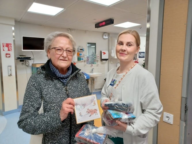 Vapaaehtoisryhmä Apuset vei 400 kpl joulukortteja sairaalan lastenpäivystykseen jaettaviksi pikkupotilaille. Yhdistyksemme- ja Apuset- ryhmän jäsen Ritva Polón kuvassa vasemmalla.