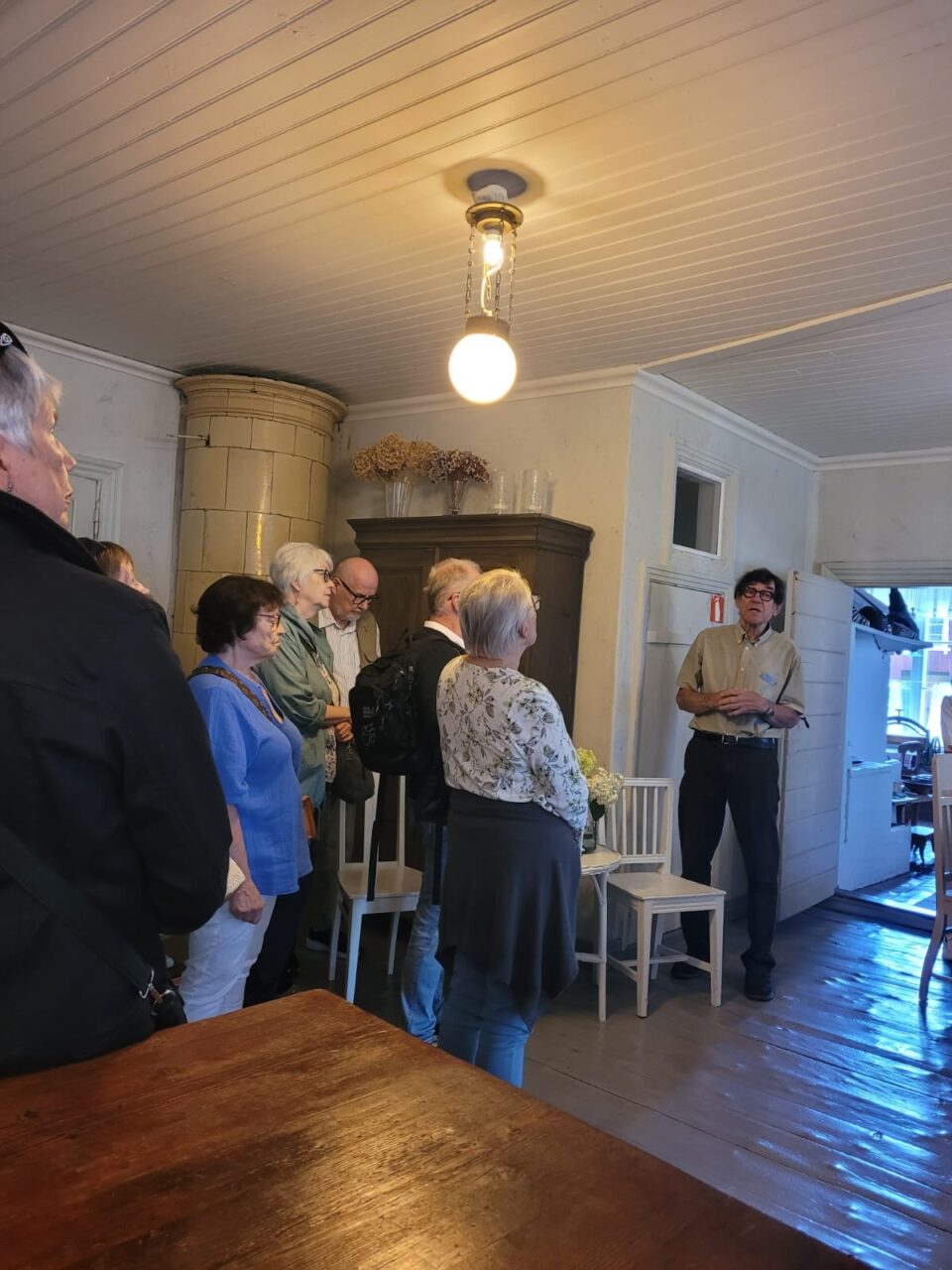 Ensimmäinen kohteemme oli Hovilan kartano, jossa Arja ja Matti Torkkomäki olivat meitä vastassa ja ansiokkaasti kertoivat talon historiasta ja restauroinnista aina 1600-luvulta nykypäiviin. Lisäksi kartanossa oli kaksi erillistä näyttelyä: emännän lentävästä työurasta kertova, näimme eri vuosikymmenten lentoemäntien pukuja ja muuta materiaalia ja talon isännän kuvia suon uumenista ja vähän muualtakin. Käräjäsalissa nautittiin aamukahvit reilun sämpylän kera. Kartano oli kunnostettu kauniisti ja ajanmukaiset huonekalut, taulut ja kattomaalaukset kertoivat osaltaan talon historiaa.